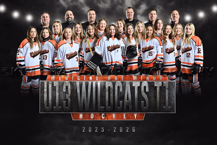Courier/Commentator Photo Submitted. WILDCATS: The Medicine Hat Minor Hockey Association is hosting the U13 Female A Alberta Provincial Championship at the Irvine Sports Complex from Mar. 19-22. Team staff are Jenn Moyer (manager), Brian Krasko (head coach), Luke Dovicha (assistant coach), Chad Kletzel (assistant coach), Mike Gergley (assistant coach), Phil Tschritter (assistant coach) and Derek Collier (assistant coach). By Nerissa McNaughton